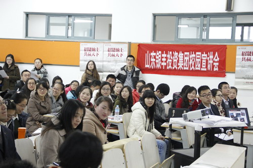 2013年11月29日上午,山東銀豐集團人力資源部在山東大學就業中心第二報告廳舉行了校園招聘宣講會。本次宣講會吸引了全國各地高校2014屆畢業生300余人,其中不乏中央財經大學、浙江大學等知名高校的畢業生。