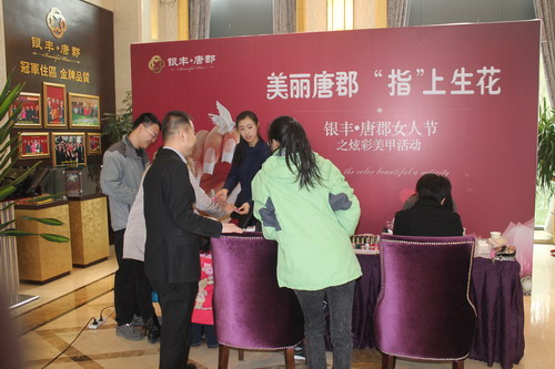 銀豐·唐郡項目營銷中心女人節之美甲活動當天,營銷中心到訪嘉賓絡繹不絕,愛美的女士們津津有味的挑選自己喜歡的美甲款式,男士們則更多的圍著沙盤細心的聽置業顧問講解銀豐·唐郡項目的情況,整個營銷中心人頭攢動、熱鬧非凡。本次活動,地產集團唐冶公司營銷部選擇時尚、自然、環保的優質美甲材料,邀請專業美甲師根據客戶的膚色、手型等特點為每位客人的十指進行消毒、清潔、護理、保養、修飾美化,深得到訪女嘉賓的喜愛。讓每一位朋友欣喜而來、滿意而歸,是銀豐·唐郡項目營銷中心每次舉辦活動的理念,不僅僅為女嘉賓創造美麗,更要通過活動為每一位到訪的嘉賓創造快樂!