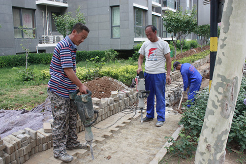社區內樓上,對建筑外立面進行維修施工的專業工人,他們是小區內的“蜘蛛人”。一根保險繩,一根作業繩,懸掛在離地數十米的高度,不顧天氣炎熱,用專業精神詮釋了認真的品質與一絲不茍的精神。不遠處,更有幾名工人對銀豐花園部分室外主管道進行更換,有的用鐵锨挖掘坑道,有的用電鉆進行地面破土,神情專注,專業用心。