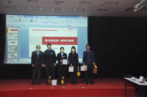 2015年1月24日,“銀豐物業第一屆知識競答”活動在銀豐大廈多功能廳舉辦。本屆競賽共由五個代表隊二十名人員參加,代表隊選手均是來自各項目的一線員工。題目內容涵蓋了物業管理知識、安全知識以及服務理念等,答題共分為“必答、搶答、風險題”三個階段。