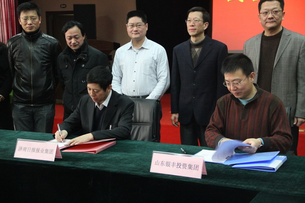 2012年2月9日上午,山東銀豐投資集團與濟南日報報業(yè)集團在銀豐大廈多功能廳正式簽署戰(zhàn)略合作協(xié)議。濟南日報報業(yè)集團董事長孫元文書記、報業(yè)集團下屬六報一網(wǎng)的各主要負責(zé)人以及銀豐集團董事長王偉、副總裁劉旭、集團公司各部門負責(zé)人共三十余人出席了簽約儀式。