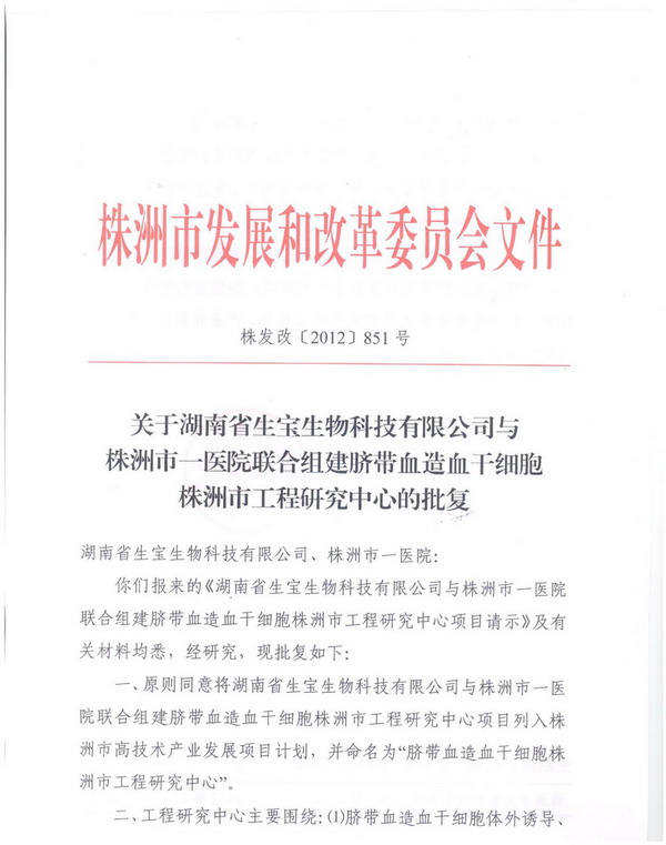 2012年12月26日湖南省生寶生物科技有限公司獲得株洲市發改委正式批復,原則上同意生寶公司與株洲市一醫院聯合組建臍帶血造血干細胞株洲市工程研究中心。這標志著湖南生寶公司今后開展的業務將更加規范化,更加有序。