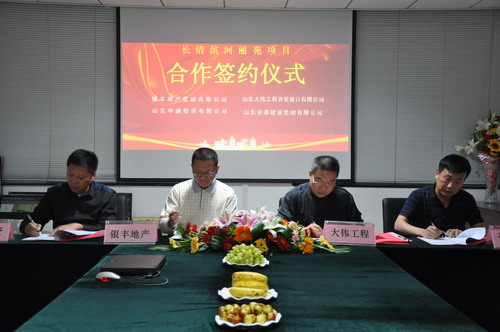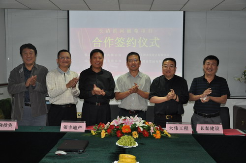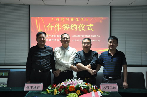 2013年9月26日,銀豐地產集團有限公司(以下簡稱銀豐地產)與山東大偉工程開發設計有限公司、山東申融投資(集團)有限公司、山東長泰建設集團有限公司、山東大融置業有限公司簽訂了關于長清項目的合作協議,簽約儀式在銀豐大廈11樓會議室隆重舉行。銀豐集團董事長王偉、副總裁劉旭、銀豐地產總經理王彤以及山東大偉工程開發設計有限公司董事長申作偉、山東申融投資(集團)有限公司董事長高文強、山東長泰建設集團有限公司副總經理劉祥共同出席了該儀式。