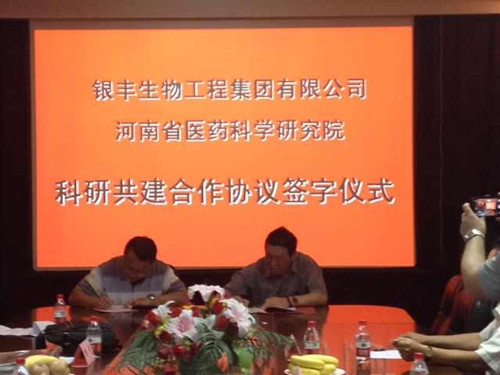 2014年7月8日,銀豐生物集團與河南省醫藥科學研究院合作協議簽約儀式在鄭州市隆重舉行,生物集團總裁生德偉與河南省醫藥科學研究院院長楊波共同簽署了共建協議。河南省科技廳社發處處長楊光、鄭州大學副校長??恕e榮海、科技處處長趙明皞受邀參加簽約儀式。楊光處長在儀式上發表重要講話,介紹了目前科技部在各省設立人類遺傳資源庫的政策,表示銀豐生物集團與河南省醫藥科學研究院強強聯手共建河南省人類遺傳資源庫是利國利民的好事,科技廳將給予大力支持。