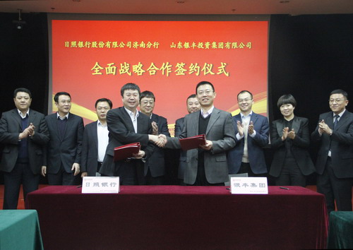 2014年12月11日,日照銀行股份有限公司濟南分行、山東銀豐投資集團有限公司全面戰略合作簽約儀式在銀豐大廈順利舉行,日照銀行濟南分行行長焦自竺、副行長王云龍等一行六人以及銀豐集團董事長王偉、副總裁趙曉陽等領導出席了本次簽約儀式。