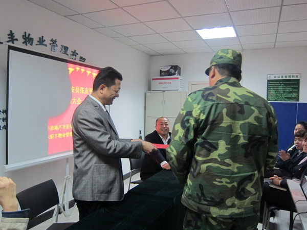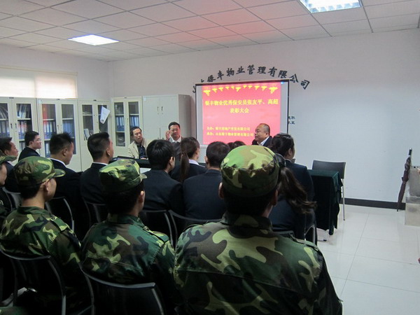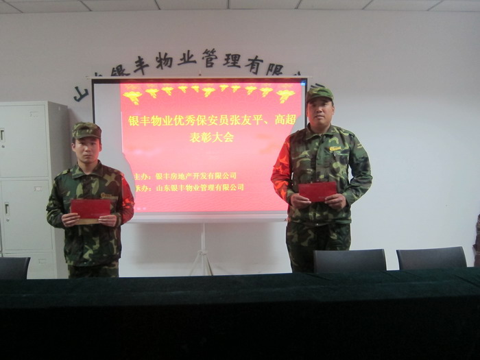 2011年11月3日下午三點,銀豐物業公司在本部會議室對優秀安保人員張友平、高超進行表彰、獎勵。